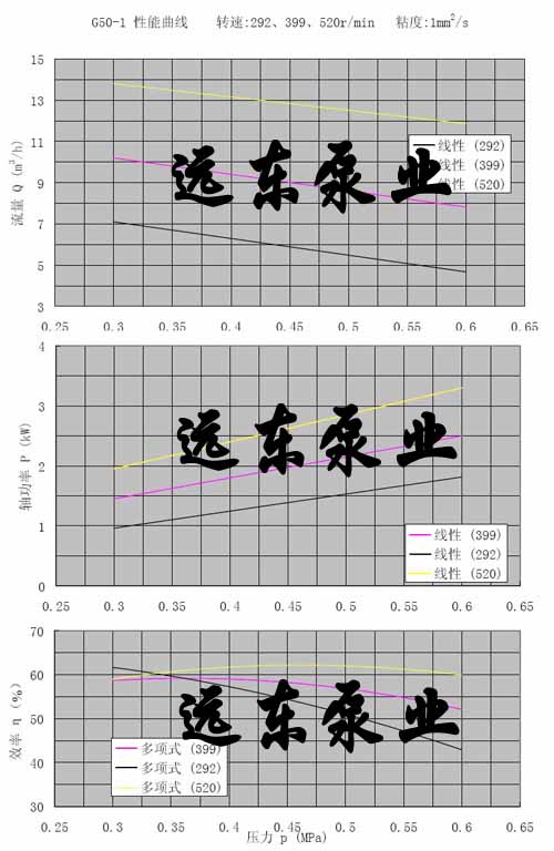 G50-1單螺桿泵(G50單螺桿泵)轉(zhuǎn)速292,399,520r/min,粘度1cst性能曲線圖