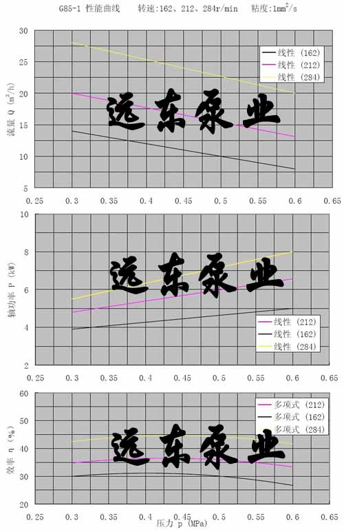 G85-1單螺桿泵(G85單螺桿泵)轉(zhuǎn)速162,212,284/min,粘度1cst性能曲線圖